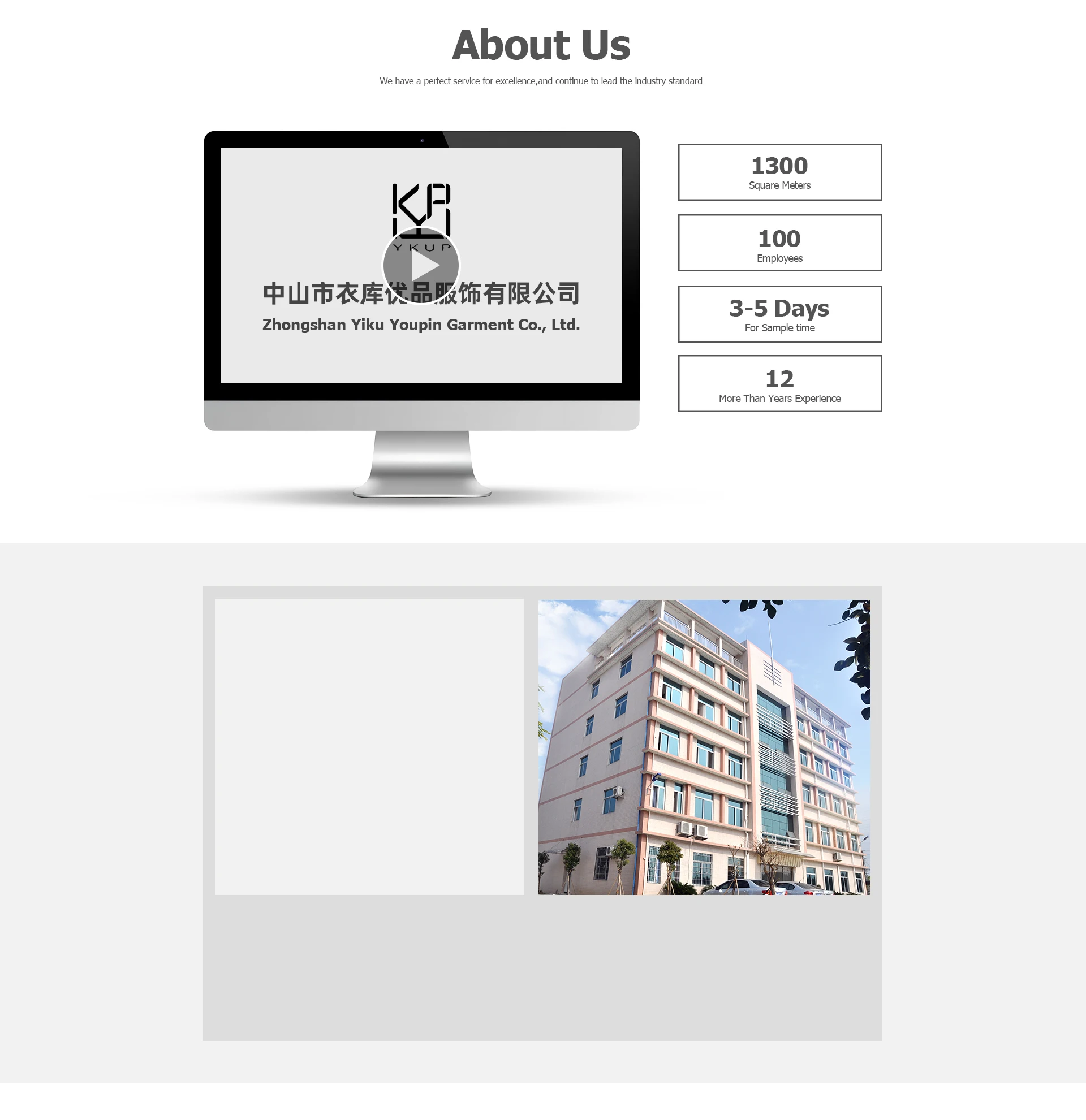 Zhongshan Yiky Youpin Garment Co., Ltd.  We are a professional manufacturer of different types of garment and bags products, integrating development and production together. Our main products include all kinds of t shirts, hoody, jacket, pants, hats,bags and related products. Factory is located in Guangdong Zhongshan, which has more than 12 years experience in clothing industry; it stably provides full series of apparel to global market with reasonable price, we also support oem and odm to your needs. We have established long-term sustainable cooperative relationships with amounts of buyers in European, American, Oceanian, Southeast Asian markets, etc. With rich experience in one-stop supply, we can provide you solid goods with wide range of collocation and infinite service.Providing one-stop ODM & OEM service with low MOQ 50pcs per design, fast turn around time 3-5 days for sampling, 7-15 days for bulk production. Leading craft in clothing industry.